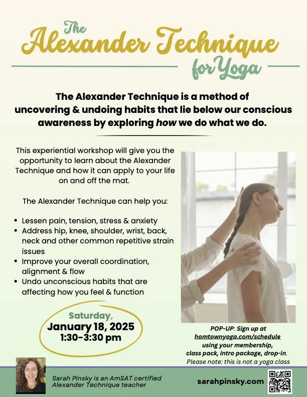 Join my sister Audrey (currently in her third and final year of training to become a Certified Alexander Technique teacher) and me while we play with the Alexander Technique. Get a peek into how we work together. See what an Alexander Technique lesson might look like. You can ask us questions and try it out, if you'd like.